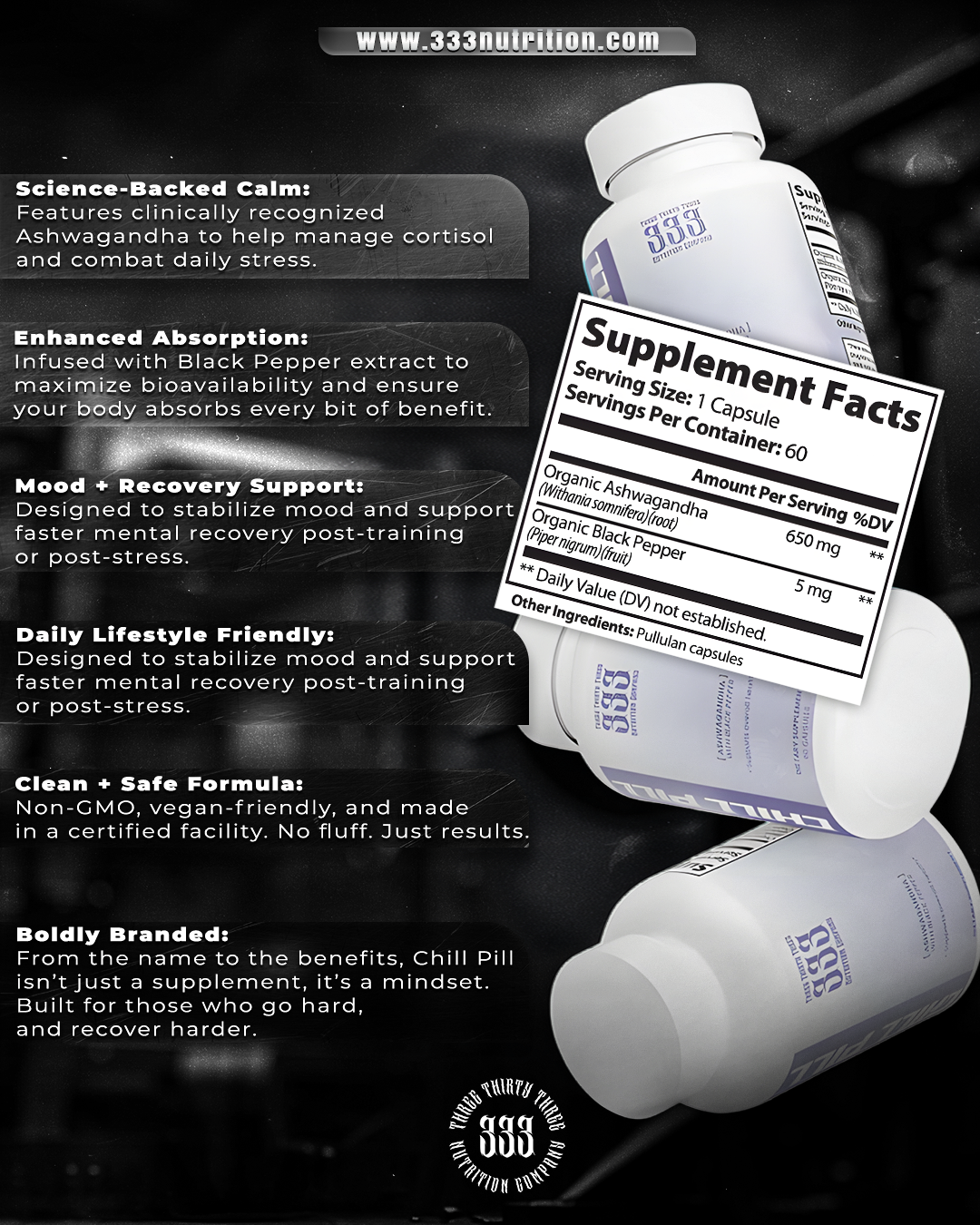 "CHILL PILL" is your mental recovery weapon. Engineered to bring calm without compromise. Formulated with Ashwagandha and enhanced with Black Pepper for better absorption, this powerful dietary supplement supports stress relief, balanced mood, and daily recovery. Whether you're crushing workouts or just need to stay composed through life's chaos, Chill Pill helps keep your edge without losing your cool.